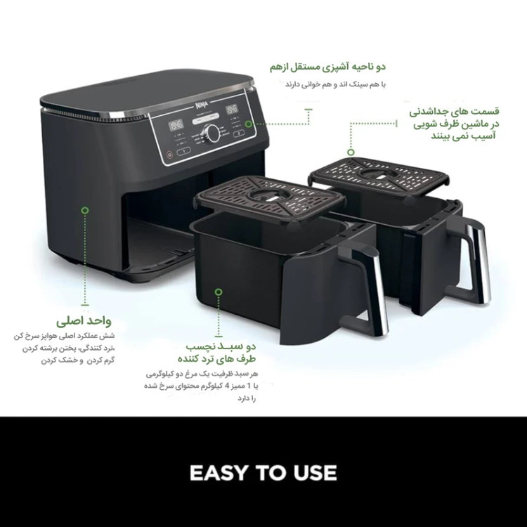_ سرخ کن بدون روغن نینجا مدل AF400EU، سیستم Dual crisp را دارا است که از دو المنت گرمایشی مجزا برای پخت یکنواخت و ترد شدن غذا از بالا و پایین استفاده میکند.