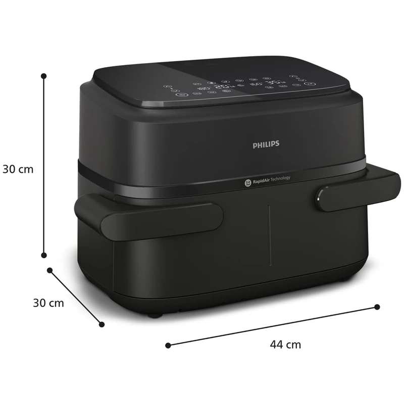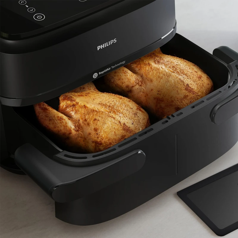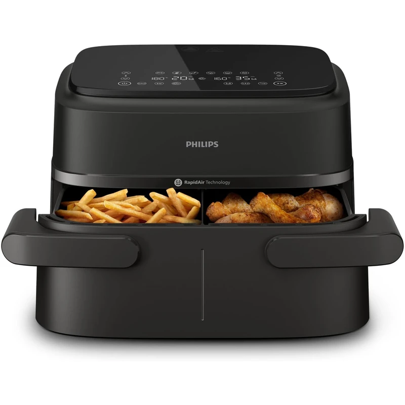 فیلیپس همیشه در طراحی محصولات خود به ترکیب راحتی و امنیت اهمیت میدهد. در NA150/09، ویژگیهایی مانند کنترل دیجیتال جداگانهی دما و زمان برای هر محفظه باعث میشود بتوانید بهصورت مستقل دو غذای متفاوت را با تنظیمات دقیق بپزید. این سطح از انعطاف، دستگاه را به انتخابی ایدهآل برای خانوادههایی تبدیل میکند که همزمان به پخت چند نوع غذا نیاز دارند. افزون بر آن، سیستم قطع خودکار هنگام پایان پخت یا در صورت افزایش بیش از حد دما، ایمنی دستگاه و مواد غذایی را تضمین میکند. وجود محافظ گرمای بیش از حد نیز مانع از ایجاد خطر در اثر کارکرد طولانی میشود. به این ترتیب کاربر میتواند با آرامش ذهنی، روند پخت را به دستگاه بسپارد. در پایان پخت هر غذای لذیذ، مرحلهی تمیزکاری اغلب بخش کمتر دلپذیر ماجراست. اما فیلیپس برای این موضوع نیز راهحلی کارآمد پیشبینی کرده است. تمامی قطعات داخلی قابل جدا شدن، از جمله سبد و محفظهی پخت، دارای روکش نچسب بوده و قابل شستوشو در ماشین ظرفشویی هستند. سطح بیرونی نیز با یک دستمال مرطوب بهسادگی تمیز میشود و فناوری گردش هوای سرد در بخش بدنه، مانع از داغ شدن بیش از حد سطح خارجی میگردد. طراحی محفظهی داخلی به شکلی انجام شده که در صورت نیاز میتوان آن را به دو بخش مجزا تقسیم کرد. این ویژگی قابلیت پخت همزمان دو نوع غذا بدون انتقال بو یا طعم را فراهم میکند و میزان انعطافپذیری دستگاه را چند برابر میسازد.