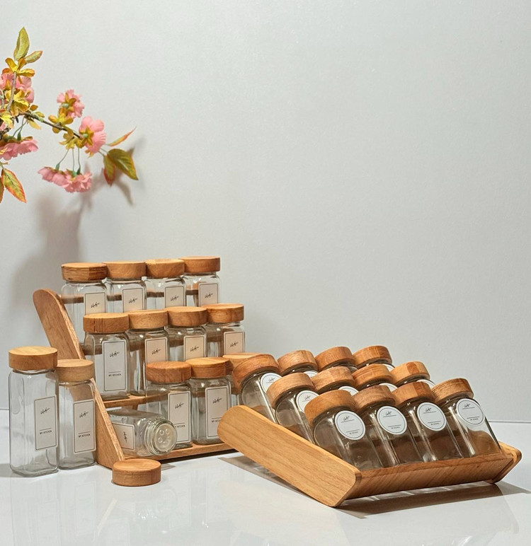زیبایی و نظم در آشپزخانه : جا ادویه های متنوع و زیبا با ترکیب چوب و شیشه ، جلوه ای خاص و دلنشین به آشپزخانه شما میبخشد .